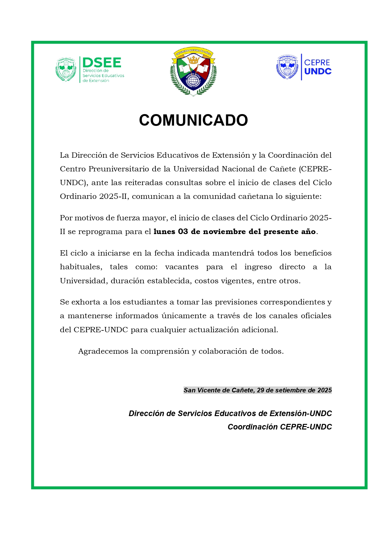 La Dirección de Servicios Educativos de Extensión y la Coordinación del Centro Preuniversitario de la Universidad Nacional de Cañete (CEPRE-UNDC), ante las reiteradas consultas sobre el inicio de clases del Ciclo Ordinario 2025-II, comunican a la comunidad cañetana lo siguiente: