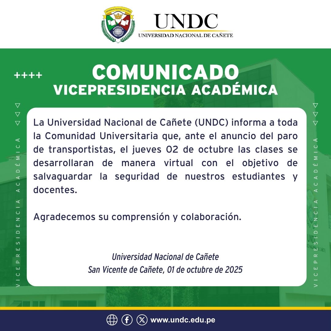 La Universidad Nacional de Cañete (UNDC) informa a toda la Comunidad Universitaria que, ante el anuncio del paro de transportistas, el jueves 02 de octubre las clases se desarrollaran de manera virtual con el objetivo de salvaguardar la seguridad de nuestros estudiantes y docentes.